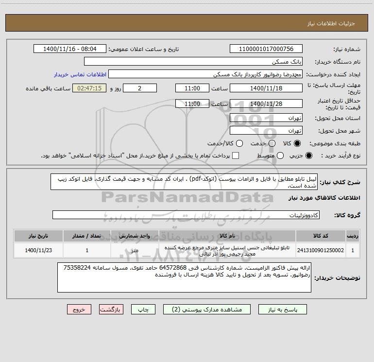 استعلام بها و موضوع استعلام استعلام لیبل تابلو مطابق با فایل و الزامات پیوست (اتوکد-pdf) . ایران کد مشابه و جهت قیمت گذاری. فایل اتوکد زیپ شده است. به اطلاع کلیه شرکتها و افراد متخصص واجد شرایط میرساند، آگهی گذار در نظر دارد از طریق استعلام بها، نسبت به انتخاب و دریافت پیشنهادات اقدام نماید. این استعلام با کد آگهی ثبت شده در سامانه خبرگزاری پارس نماد : 4227068 منتشر شده است. مشخصات استعلام : تاریخ شروع استعلام: 1400/11/16 آخرین مهلت ارسال پیشنهاد قیمت : 1400/11/18 و محل اجرای پروژه : استان تهران میباشد. استعلام قیمت مورد درخواست : استعلام لیبل تابلو مطابق با فایل و الزامات پیوست (اتوکد-pdf) . ایران کد مشابه و جهت قیمت گذاری. فایل اتوکد زیپ شده است. با دستهبندیهای تخصصی و گروه های مرتبط : طراحی چاپ و تبلیغات, لیبل, قطعات استنلس استیل, استعلام اطلاع رسانی میگردد. شرایط شرکت در استعلام آنلاین : ابتدا ثبت نام در سامانه استعلام پارس نماد و تکمیل مدارک موردنیاز و بارگذاری در سامانه رعایت تمامی ضوابط و الزامات مندرج در اسناد استعلام است.