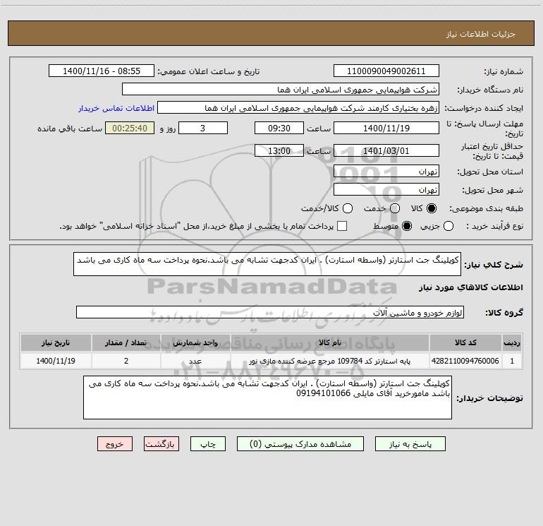 شرح کلی نیاز: کوپلینگ جت استارتر (واسطه استارت) . ایران کدجهت تشابه می باشد.نحوه پرداخت سه ماه کاری می باشد