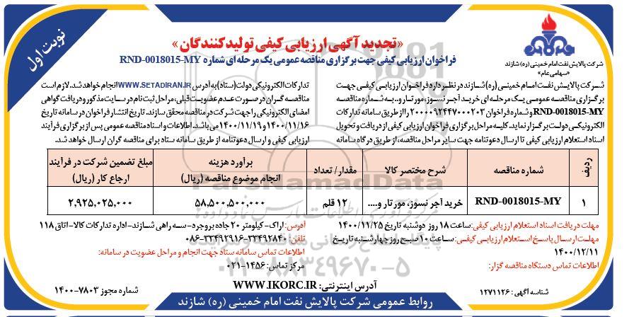 فراخوان ارزیابی کیفی جهت برگزاری مناقصه عمومی یک مرحله ای شماره RND-0018015-MY