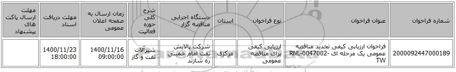 مناقصه، فراخوان ارزیابی کیفی تجدید مناقصه عمومی یک مرحله ای RNL-0047002-TW از کلیه افراد متخصص و شرکتها واجد شرایط دعوت به عمل میآید در مناقصه با کد خبرگزاری پارس نماد: 4228286 شرکت نمایند.