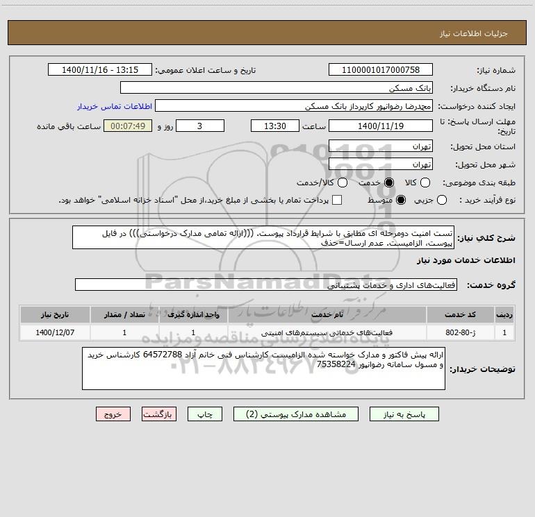 شرح کلی نیاز: تست امنیت دومرحله ای مطابق با شرایط قرارداد پیوست. (((ارائه تمامی مدارک درخواستی))) در فایل پیوست، الزامیست. عدم ارسال=حذف