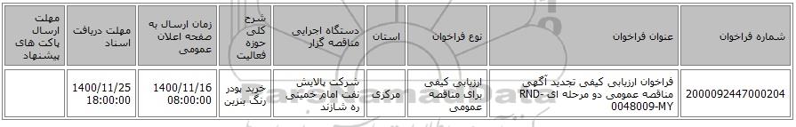 مناقصه، فراخوان ارزیابی کیفی تجدید آگهی مناقصه عمومی دو مرحله ای RND-0048009-MY, فراخوان ارزیابی کیفی تجدید آگهی مناقصه عمومی دو مرحله ای RND-0048009-MY
