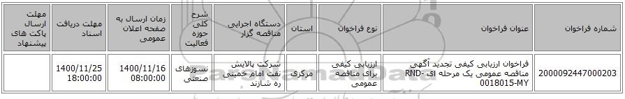 مناقصه، فراخوان ارزیابی کیفی تجدید آگهی مناقصه عمومی یک مرحله ای RND-0018015-MY, فراخوان ارزیابی کیفی تجدید آگهی مناقصه عمومی یک مرحله ای RND-0018015-MY
