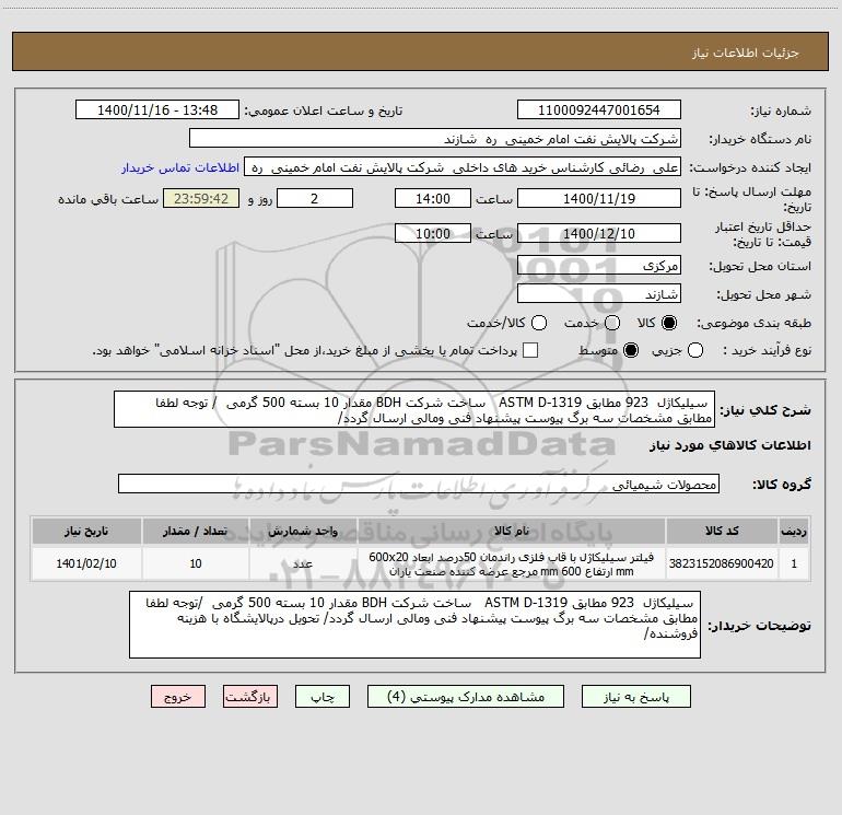 توضیحات خریدار: سیلیکاژل 923 مطابق ASTM D-1319 ساخت شرکت BDH مقدار 10 بسته 500 گرمی /توجه لطفا مطابق مشخصات سه برگ پیوست پیشنهاد فنی ومالی ارسال گردد/ تحویل درپالایشگاه با هزینه فروشنده/