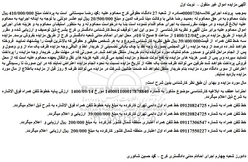 بموجب پرونده اجرایی کلاسه0000736صادره از شعبه 27 دادگاه حقوقی کرج محکوم علیه :محمد رضا سیستانی است به پرداخت مبلغ 410/000/000 ریال بابت محکوم به در حق محکوم له :حمید رضا خانی با وکالت مینا شرف الدین و مبلغ 20/500/000 ریال نیم عشر دولتی. با توجه به اینکه اجراییه به محکوم علیه ابلاغ گردیده و در مهلت مقررنسبت به اجرای حکم اقدام ننموده است بنا به درخواست محکوم له و به منظور استیفای محکوم به و هزینه های اجرایی اموال محکوم علیه برابر متن آگهی و نظریه کارشناسی از سوی این اجرا توقیف توسط کارشناس دادگستری کرج بشرح ذیل توصیف و ارزیابی شده و مقرر گردیده از طریق مزایده درمورخ1400/12/04 از ساعت 9 صبح تا 10در محل اجرای احکام مدنی شعبه دادگستری کرج از طریق مزایده بفروش برسد. مزایده سه خط تلفن همراه از قیمت39/400/000 ریال طبق نظریه کارشناس شروع و به هر شخص حقیقی و حقوقی که بالاترین قیمت را پیشنهاد نمایید فروخته خواهد شد. ده درصد از وجه مزایده را فی المجلس بصورت وجه نقد یا چک بانکی تضمینی از خریدار اخذ و الباقی وجه مزایده ظرف یک ماه از وی وصول و پس از انجام مراحل قانونی و صدور حکم تملیک مورد مزایده به نام خریدار منتقل خواهد شد. در صورتی که در مهلت مقرر خریدار وجه مزایده را پرداخت ننماید سپرده وی پس از کسر هزینه های مزایده به نفع دولت ضبط و مزایده تجدید می گردد. کلیه هزینه های نقل وانتقال بعهده محکوم علیه است که از محل فروش پرداخت خواهد شد طرفین می توانند ظرف مدت یک هفته از تاریخ مزایده نسبت به نحوه انجام مزایده اعتراض نمایند که در این صورت تا رسیدگی به اعتراض از سوی دادگاه مورد مزایده بنام خریدار منتقل نخواهد شد ضمنا طالبین شرکت در مزایده می توانند ظرف 5 روز قبل از مزایده بااطلاع از مال مورد مزایده بازدید نمایند.