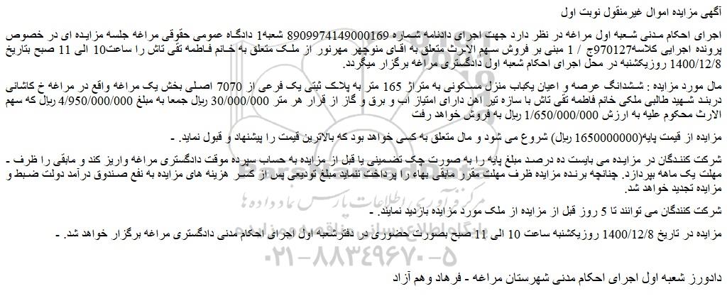 مال مورد مزایده : ششدانگ عرصه و اعیان یکباب منزل مسکونی به متراژ 165 متر به پلاک ثبتی یک فرعی از 7070 اصلی بخش یک مراغه واقع در مراغه خ کاشانی دربند شهید طالبی ملکی خانم فاطمه تقی تاش با سازه تیر اهن دارای امتیاز اب و برق و گاز از قرار هر متر 30/000/000 ریال جمعا به مبلغ 4/950/000/000 ریال که سهم الارث محکوم علیه به ارزش 1/650/000/000 ریال به فروش خواهد رفت
