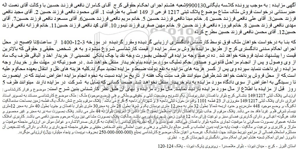 آگهی مزایده : به موجب پرونده کلاسه بایگانی9900130شعبه هشتم اجرای احکام حقوقی کرج آقای کامران نافعی فرزند حسین با وکالت آقای نعمت اله عنبرستانی درخواست فروش ملک مشاع موضوع پلاک ثبتی 1217 فرعی از 149 اصلی به طرفیت 1. آقای محمود نافعی فرزند حسین 2. آقای مجید نافعی فرزند حسین3. آقای علی نافعی فرزند حسین 4. خانم مینا نافعی فرزند حسین 5. خانم مریم نافعی فرزند حسین6. آقای مسعود نافعی فرزند حسین7. آقای مهدی نافعی فرزند حسین 8. خانم فیروزه نافعی فرزند حسین 9. خانم مهین صفری فرزند تیمور10. آقای محمد نافعی فرزند حسین11. خانم فرزانه نافعی فرزند حسین12. آقای محسن نافعی فرزند حسین مطرح کرده