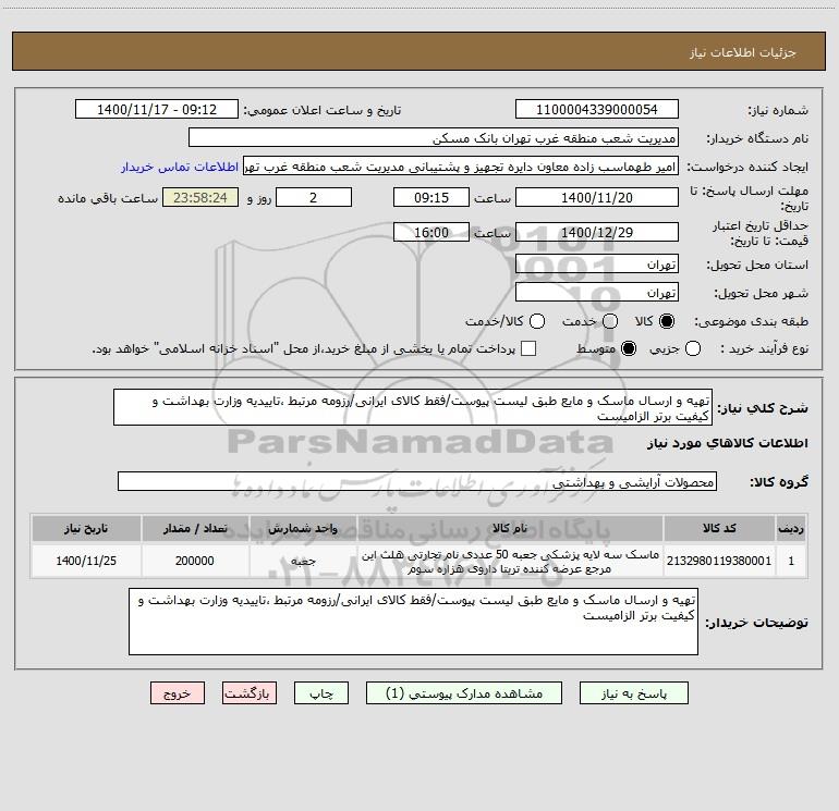 شرح کلی نیاز: تهیه و ارسال ماسک و مایع طبق لیست پیوست/فقط کالای ایرانی/رزومه مرتبط ،تاییدیه وزارت بهداشت و کیفیت برتر الزامیست