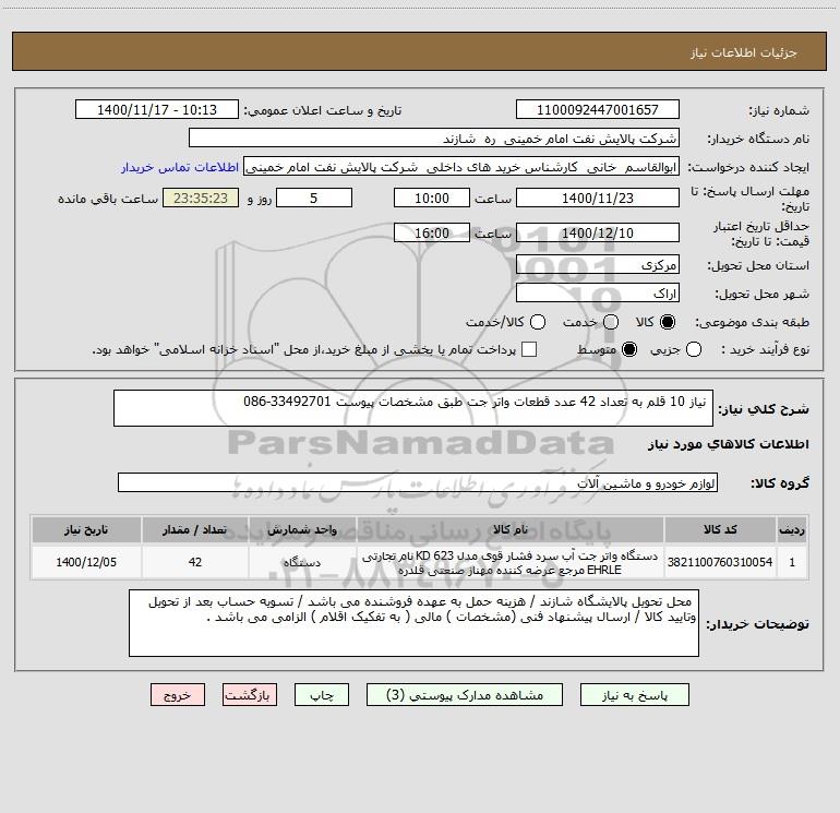 شرح کلی نیاز: نیاز 10 قلم به تعداد 42 عدد قطعات واتر جت طبق مشخصات پیوست 33492701-086