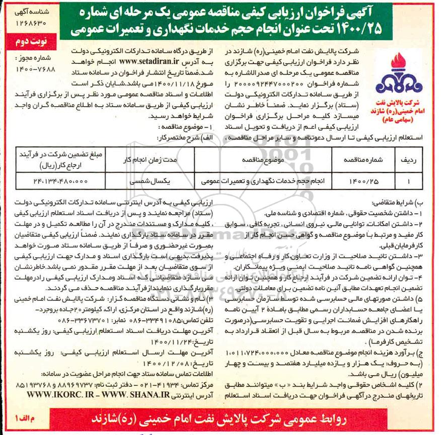 فراخوان ارزیابی کیفی مناقصه انجام حجم خدمات نگهداری و تعمیرات عمومی - نوبت دوم, فراخوان ارزیابی کیفی مناقصه انجام حجم خدمات نگهداری و تعمیرات عمومی - نوبت دوم