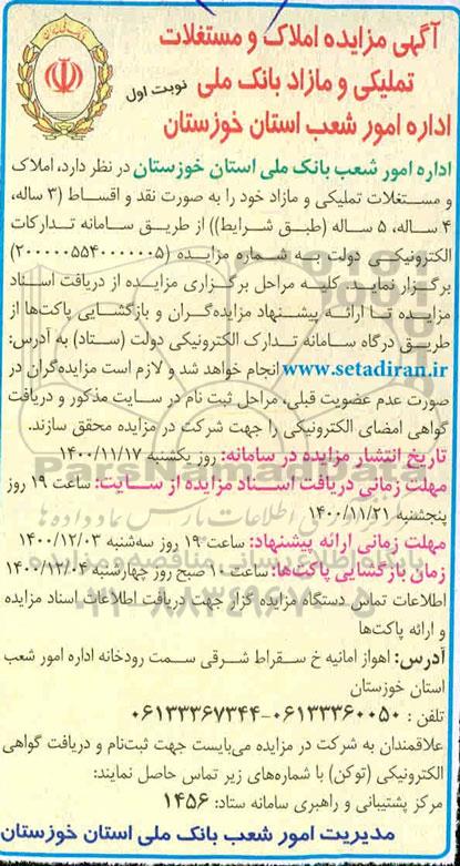 مزایده عمومی مزایده املاک و مستغلات تملیکی و مازاد نوبت اول برگزار میگردد. از کلیه افراد متخصص و شرکتهای واجد شرایط دعوت به عمل میآید تا در این مزایده با کد خبرگزاری پارس نماد : 4232924 شرکت نمایند تاریخ شروع مزایده : 1400/11/17 مهلت شرکت در مزایده: تا پایان روز 1400/11/21 مکان برگزاری اموال واگذاری استانهای خوزستان و دستهبندیهای مربوط به این حراجی املاک و زمین میباشد.