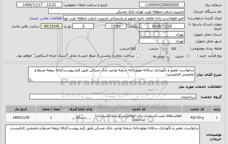 استعلام درخواست تعمیر و نگهداری سالانه موتورخانه شعبه توحید بانک مسکن طبق فرم پیوست/ارائه رزومه مرتبط و تخصصی الزامیست, استعلام درخواست تعمیر و نگهداری سالانه موتورخانه شعبه توحید بانک مسکن طبق فرم پیوست/ارائه رزومه مرتبط و تخصصی الزامیست