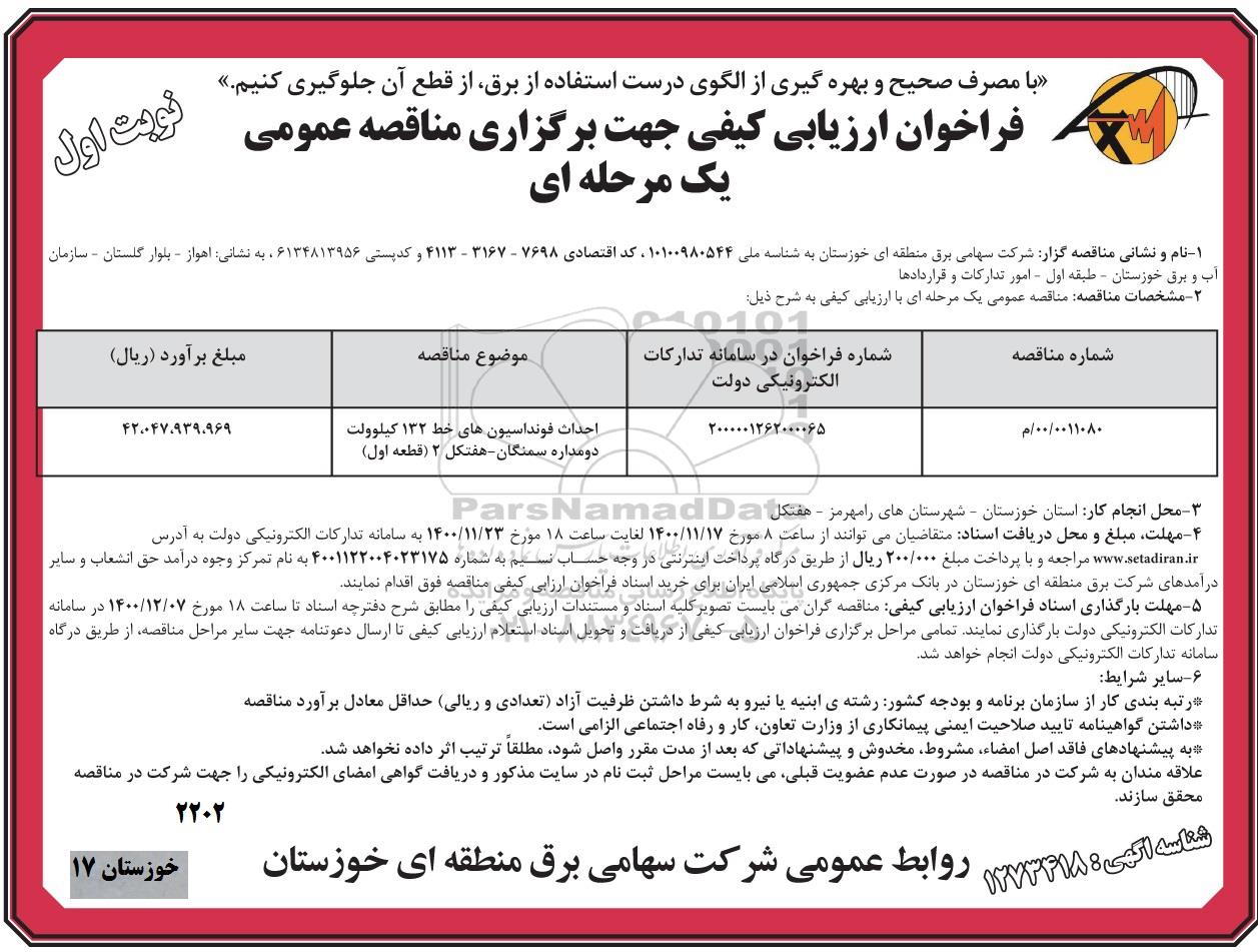 فراخوان مناقصه احداث فوندانسیون های خط 132 کیلوولت دو مداره, فراخوان مناقصه احداث فوندانسیون های خط 132 کیلوولت دو مداره