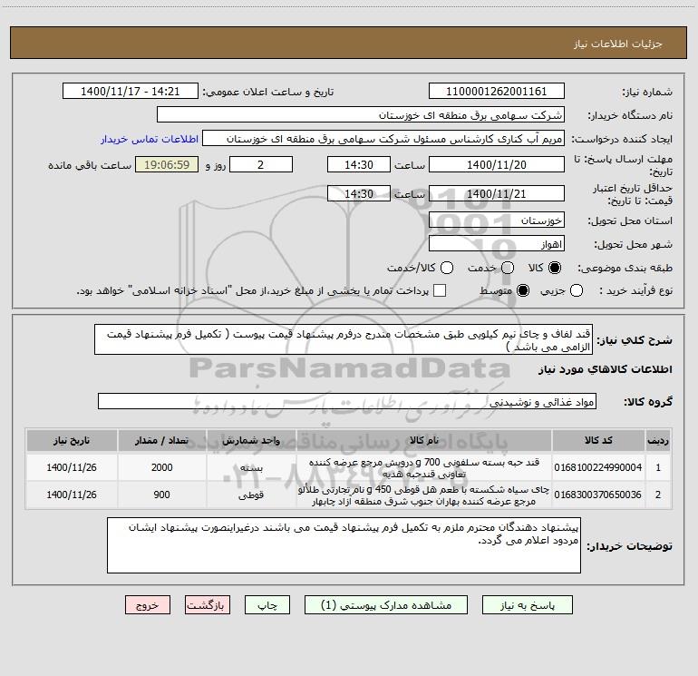 شرح کلی نیاز: قند لفاف و چای نیم کیلویی طبق مشخصات مندرج درفرم پیشنهاد قیمت پیوست ( تکمیل فرم پیشنهاد قیمت الزامی می باشد )