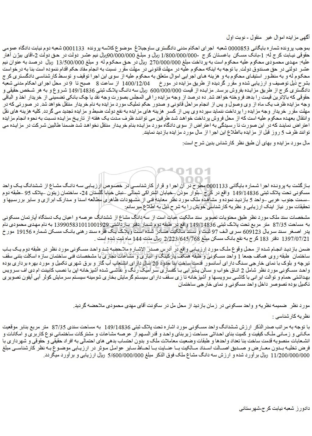 بموجب پرونده شماره بایگانی 0000853 شعبه اجرای احکام مدنی دادگستری ساوجبلاغ موضوع کلاسه پرونده 0001133 شعبه دوم نیابت دادگاه عمومی حقوقی نیابت کرج له: 1-بانک مسکن باغستان کرج -1/800/000/000 ریال و مبلغ 90/000/000ریال نیم عشر دولت در حق دولت 2-اقای بیژن آهار علیه: مهدی محمودی محکوم علیه محکوم است به پرداخت مبلغ 270/000/000 ریال در حق محکوم له و مبلغ 13/500/000 ریال درصد به عنوان نیم عشر دولتی در حق صندوق دولت. با توجه به اینکه محکوم علیه در مهلت قانونی در مهلت مقرر نسبت به انجام مفاد حکم اقدام ننموده است بنا به درخواست محکوم له و به منظور استیفای محکوم به و هزینه های اجرایی اموال متعلق به محکوم علیه از سوی این اجرا توقیف و توسط کارشناسی دادگستری کرج بشرح ذیل توصیف و ارزیابی شده و مقرر گردیده از طریق مزایده در مورخ 1400/12/04 از ساعت 8 صبح تا 9 در محل اجرای احکام مدنی شعبه دادگستری کرج از طریق مزایده بفروش برسد. مزایده از قیمت 600/000/000 ریال سه دانگ پلاک ثبتی 149/14836 شروع و به هر شخص حقیقی و حقوقی که بالاترین قیمت را بدهد فروخته خواهد شد. ده درصد از وجه مزایده را فی المجلس بصورت وجه نقد یا چک بانکی تضمینی از خریدار اخذ و الباقی وجه مزایده ظرف یک ماه از وی وصول و پس از انجام مراحل قانونی و صدور حکم تملیک مورد مزایده به نام خریدار منتقل خواهد شد. در صورتی که در مهلت مقرر خریدار وجه مزایده را پرداخت ننماید سپرده وی پس از کسر هزینه های مزایده به نفع دولت ضبط و مزایده تجدید می گردد. کلیه هزینه های نقل وانتقال بعهده محکوم علیه است که از محل فروش پرداخت خواهد شد طرفین می توانند ظرف مدت یک هفته از تاریخ مزایده نسبت به نحوه انجام مزایده اعتراض نمایند که در این صورت تا رسیدگی به اعتراض از سوی دادگاه مورد مزایده بنام خریدار منتقل نخواهد شد ضمنا طالبین شرکت در مزایده می توانند ظرف 5 روز قبل از مزایده بااطلاع این اجرا از مال مورد مزایده بازدید نمایند.