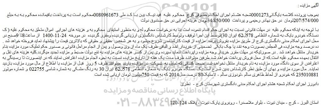 با توجه به اینکه محکوم علیه  در مهلت قانونی نسبت به اجرای حکم اقدام ننموده است بنا به درخواست محکوم له و به منظور استیفای  محکوم به و هزینه های اجرایی  اموال متعلق به محکوم علیه ( ک دستگاه خودرو بایک به شماره انتظامی 578ل62 ایران 30)توسط این اجرا توقیف وتوسط کارشناس دادگستری ارزیابی گردیده ومقرر گردیده  در مورخه  24-11-1400  از ساعت8تا 9صبح در محل اجرای احکام مدنی دادگستری کرج از طریق مزایده بفروش برسد. مزایده از قیمت کارشناسی شروع میشود و به هر شخص  حقیقی و حقوقی که بالاترین قیمت را پیشنهاد نماید فروخته خواهد شد . ده درصد وجه مزایده فی المجلس بصورت وجه نقد یا چک بانکی  تضمینی از خریدار اخذ و الباقی ظرف یک ماه از وی وصول و پس از انجام مراحل قانونی و صدور حکم تملیک مورد مزایده بنام خریدار منتقل خواهد شد . در صورتیکه در مهلت مقرر خریدار وجه مزایده راپرداخت ننماید سپرده وی پس از کسر هزینه های مزایده به نفع دولت ضبط و مزایده تجدید میگردد.کلیه هزینه های نقل و انتقال بعهده محکوم علیه است.که از محل فروش پرداخت خواهد شد.طرفین میتوانند ظرف مدت یک هفته از تاریخ مزایده نسبت به نحوه انجام مزایده اعتراض نمایند که در اینصورت تا رسیدگی به اعتراض از سوی دادگاه مورد مزایده به نام خریدار منتقل نخواهد شد. ضمناً کسانی که تمایل به  شرکت  در مزایده دارند  میتوانند ظرف 5 روز  قبل از مزایده با اطلاع از مال مورد مزایده بازدید نمایند. مال مورد مزایده و بهای آن طبق نظر کارشناس بدین شرح است:یک دستگاه خودرو بایک به شماره انتظامی 578ل62 ایران 30 به رنگ مشکی به شماره شاسی 022755 و شماره موتور 235010881 که خودرو از لحاظ ظاهری سالم -تودوزی سالم - لاستیک80 درصد-مدل2014 که به قیمت 750میلیون تومان اریابی شده است