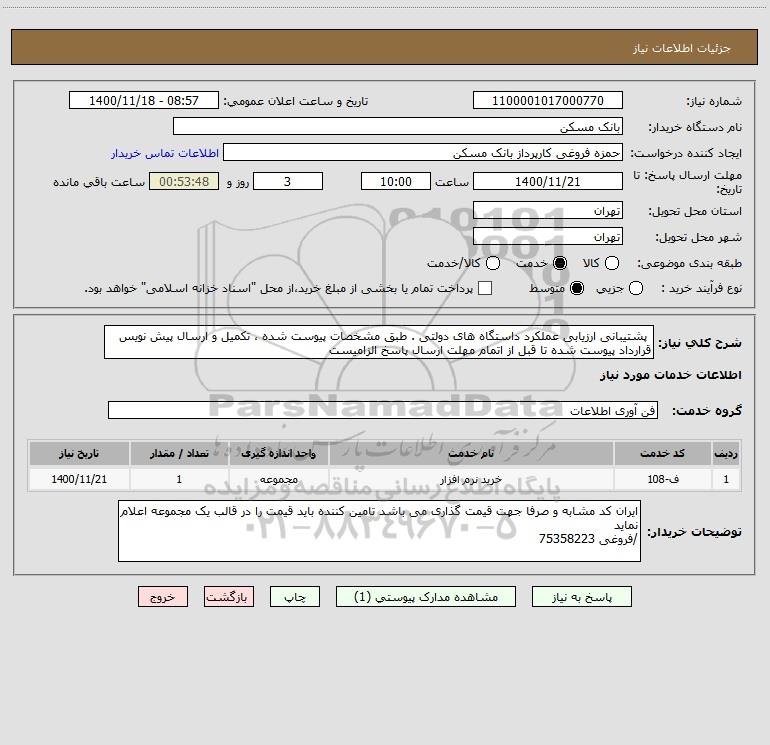 شرح کلی نیاز: پشتیبانی ارزیابی عملکرد داستگاه های دولتی . طبق مشخصات پیوست شده ، تکمیل و ارسال پیش نویس قرارداد پیوست شده تا قبل از اتمام مهلت ارسال پاسخ الزامیست
