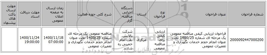 مناقصه، فراخوان ارزیابی کیفی مناقصه عمومی یک مرحله ای شماره 1400/25 تحت عنوان انجام حجم خدمات نگهداری و تعمیرات عمومی, فراخوان ارزیابی کیفی مناقصه عمومی یک مرحله ای شماره 1400/25 تحت عنوان انجام حجم خدمات نگهداری و تعمیرات عمومی