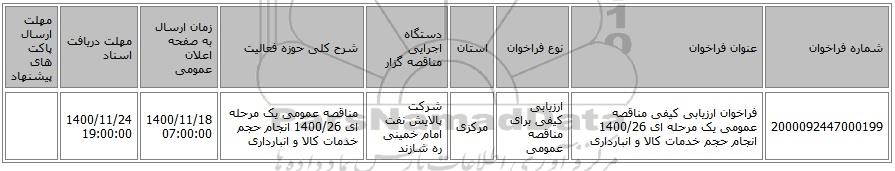 | 2000092447000199 | فراخوان ارزیابی کیفی مناقصه عمومی یک مرحله ای 1400/26 انجام حجم خدمات کالا و انبارداری | ارزیابی کیفی برای مناقصه عمومی | مرکزی | شرکت پالایش نفت امام خمینی ره شازند | مناقصه عمومی یک مرحله ای 1400/26 انجام حجم خدمات کالا و انبارداری | 1400/11/18 07:00:00 | 1400/11/24 19:00:00 |