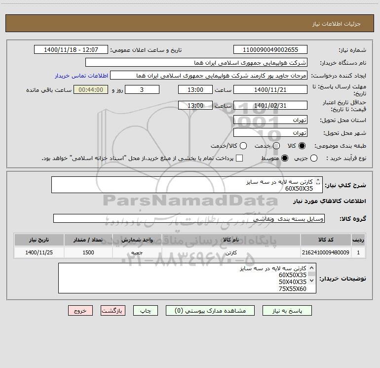 شرح کلی نیاز: کارتن سه لایه در سه سایز