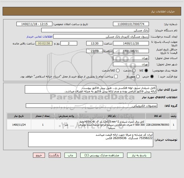 شرح کلی نیاز: کابل شیلدار نسوز، لوله فلکسی و... طبق پیش فاکتور پیوست. ارائه پیش فاکتور الزامی بوده و عدم ارائه پیش فاکتور به منزله انصراف میباشد.
