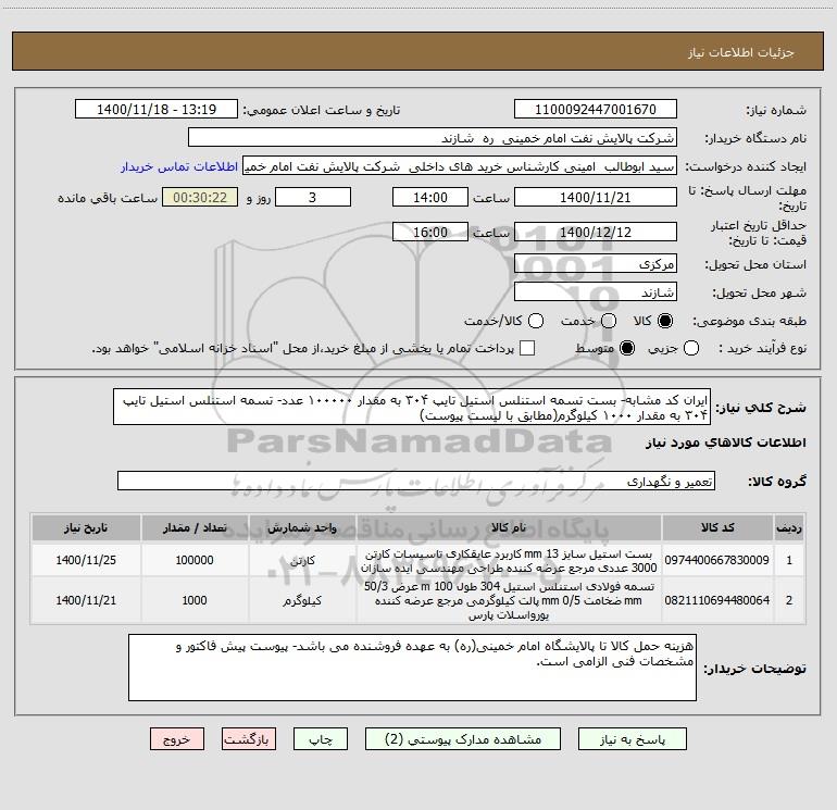 شرح کلی نیاز: ایران کد مشابه- بست تسمه استنلس استیل تایپ ۳۰۴ به مقدار ۱۰۰۰۰۰ عدد- تسمه استنلس استیل تایپ ۳۰۴ به مقدار ۱۰۰۰ کیلوگرم(مطابق با لیست پیوست)