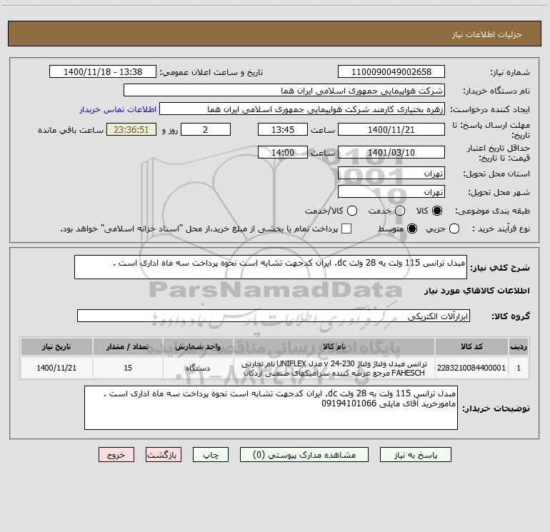 استعلام مبدل ترانس 115 ولت به 28 ولت dc. ایران کدجهت تشابه است نحوه پرداخت سه ماه اداری است . , استعلام مبدل ترانس 115 ولت به 28 ولت dc. ایران کدجهت تشابه است نحوه پرداخت سه ماه اداری است .