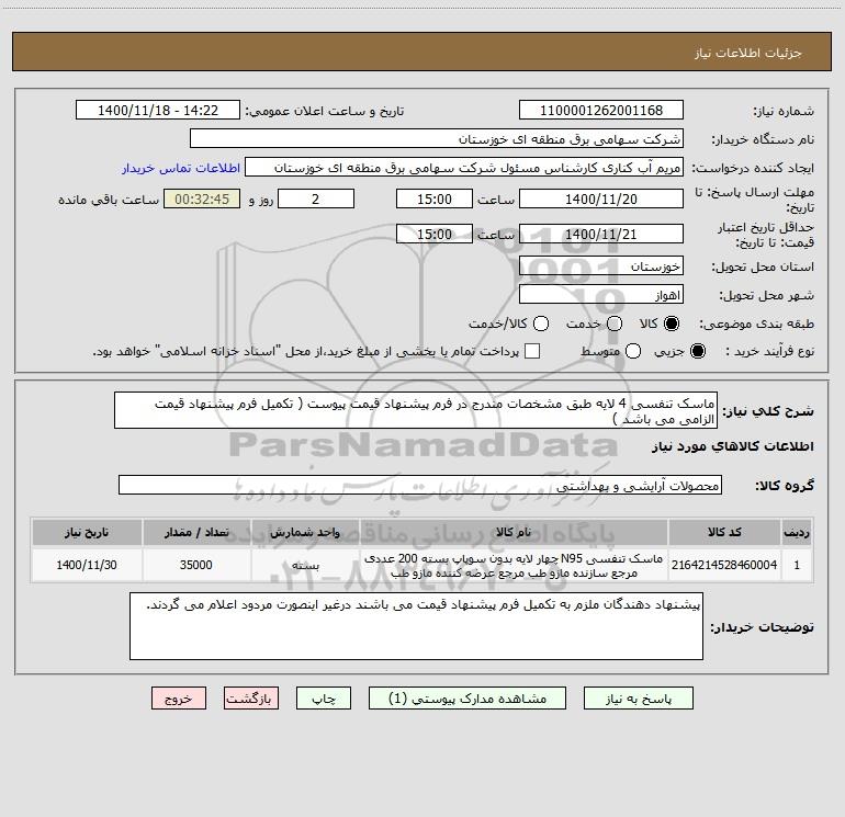 شرح کلی نیاز: ماسک تنفسی 4 لایه طبق مشخصات مندرج در فرم پیشنهاد قیمت پیوست ( تکمیل فرم پیشنهاد قیمت الزامی می باشد )