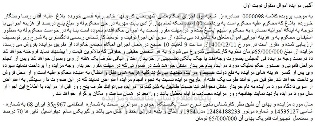 به موجب پرونده کلاسه 0000098 صادره از شعبه اول اجرای احکام مدنی شهرستان کرج لها: خانم رقیه قدسی خورده بلاغ علیه: آقای رضا رستگار خورده بلاغ که محکوم علیه محکوم است به پرداخت 100عدد سکه تمام بهار آزادی بابت مهریه در حق محکوم له و مبلغ پنج درصد از هزینه اجرایی با توجه به اینکه اجرائیه صادره به محکوم علیهم ابلاغ شده و در مهلت مقرر نسبت به اجرای حکم اقدام ننموده است بنا به در خواست محکوم له به منظور استیفای محکوم به و هزینه اجرایی اموال متعلق به نامبرده می باشد، از سوی این اجرا توقیف و توسط کارشناس رسمی دادگستری به شرح زیر توصیف ارزیابی شده و مقرر است در مورخ 1400/12/11از ساعت 9 لغایت 10 صبح در محل اجرای احکام مجتمع خانواده از طریق مزایده بفروش می رسد، مزایده از مبلغ 65/000/000تومان نظریه کارشناسی شروع می شود و به هر شخص حقیقی و حقوقی که بالاترین قیمت را پیشنهاد نماید فروخته خواهد شد ده درصد وجه مزایده فی المجلس بصورت وجه نقد یا چک بانکی تضمینی از خریدار اخذ و الباقی ظرف یک هفته از وی وصول خواهد شد وپس از انجام مراحل قانونی و صدور حکم تملیک مورد مزایده بنام خریدار منتقل خواهد شد در صورتی که در مهلت مقرر خریدار وجه مزایده را پرداخت ننماید سپرده وی پس از کسر هزینه های مزایده به نفع دولت ضبط و مزایده تجدید می گردد کلیه هزینه های نقل و انتقال به عهده محکوم علیه است و از محل فروش پرداخت خواهد شد. طرفین می توانند ظرف یک هفته از تاریخ مزایده نسبت به نحوه انجام مزایده اعتراض نمایند که در این صورت تا رسیدگی به اعتراض از سوی دادگاه مورد مزایده به نام خریدار منتقل نخواهد شد ضمنا طالبین به شرکت در مزایده می توانند ظرف پنج روز قبل از مزایده با اطلاع این اجرا از مال مورد مزایده بازدید نمایند چنانچه روز مزایده مصادف با ایام تعطیل باشد روز بعد در همان ساعت و مکان برگزار خواهد شد .