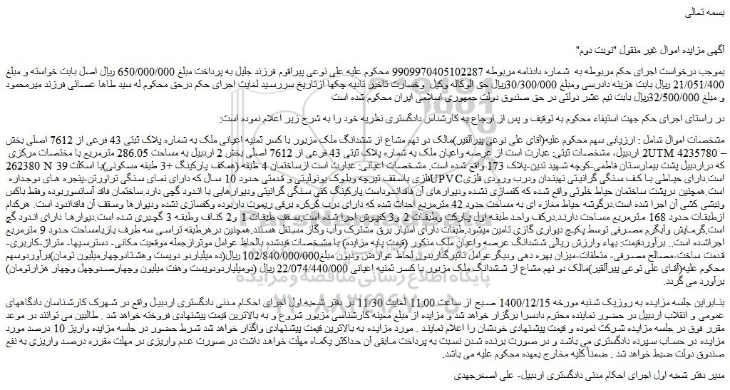 مشخصات اموال شامل : ارزیابی سهم محکوم علیه(آقای علی نوعی پیرآلقیر)مالک دو نهم مشاع از ششدانگ ملک مزبور با کسر ثمنیه اعیانی ملک به شماره پلاک ثبتی 43 فرعی از 7612 اصلی بخش 2 اردبیل، مشخصات ثبتی: عبارت است از عرصه واعیان ملک به شماره پلاک ثبتی 43 فرعی از 7612 اصلی بخش 2 اردبیل به مساحت 286.05 مترمربع با مختصات مرکزی UTM 4235780 – 262380 N 39 که دراردبیل پشت بیمارستان فاطمی-کوچه شهید تدین-پلاک 173 واقع شده است. مشخصات اعیانی: عبارت است ازساختمان 4 طبقه (همکف پارکینگ +3 طبقه مسکونی)با اسکلت فلزی باسقف تیرچه وبلوک یونولیتی و قدمتی حدود 10 سال که دارای نمای سنگی تراورتن-پنجره های دوجداره UPVC است.دارای حیاطی با کف سنگی گرانیتی نهبندان ودرب ورودی فلزی است.همچنین درپشت ساختمان حیاط خلوتی واقع شده که کفسازی نشده ودیوارهای آن فاقداندوداست.پارکینگ کفی سنگی گرانیتی ودیوارهایی با اندود گچی دارد.ساختمان فاقد آسانسوربوده وفقط باکس ونبشی کشی آن اجرا شده است.درگوشه حیاط مغازه ای به مساحت حدود 42 مترمربع احداث شده که دارای درب کرکره برقی ریموت داربوده وکفسازی نشده ودیوارها وسقف آن فاقداندود است. هرکدام ازطبقات حدود 168 مترمربع مساحت دارند.درکف واحد طبقه اول پارکت وطبقات 2 و3 کفپوش اجرا شده است.سقف طبقات 1 و2 کناف وطبقه 3 گچبری شده است.دیوارها دارای اندود گچ است.گرمایش وآبگرم مصرفی توسط پکیج دیواری گازی تامین میشود.طبقات دارای امتیاز برق مشترک وآب وگاز مستقل هستند.همچنین درهرطبقه تراسی سه طرف بازبامساحت حدود 9 مترمربع اجراشده است.. برآوردقیمت: بهاء وارزش ریالی ششدانگ عرصه واعیان ملک مذکور (قیمت پایه مزایده) با مشخصات قیدشده بالحاظ عوامل موثرازجمله موقعیت مکانی- دسترسیها- متراژ-کاربری-قدمت ساخت-مصالح مصرفی- متعلقات-میزان بهره دهی ودیگرعوامل تاثیرگذاربدون لحاظ عوارض ودیون مبلغ102/840/000/000 ریال(ده میلیاردو دویست وهشتادوچهارمیلیون تومان)برآوردوسهم محکوم علیه(آقای علی نوعی پیرآلقیر)مالک دو نهم مشاع از ششدانگ ملک مزبور با کسر ثمنیه اعیانی 22/074/440/000 ریال (دومیلیاردودویست وهفت میلیون وچهارصدوچهل وچهار هزارتومان) برآورد می گردد.