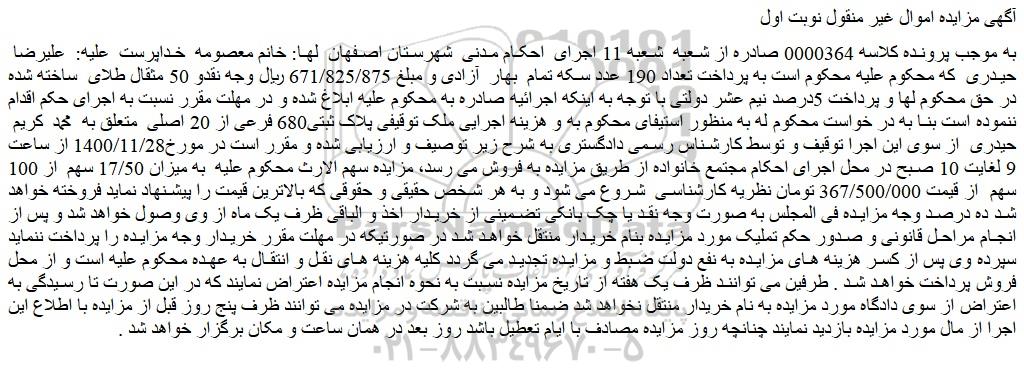 به موجب پرونده کلاسه 0000364 صادره از شعبه شعبه 11 اجرای احکام مدنی شهرستان اصفهان لها: خانم معصومه خداپرست علیه: علیرضا حیدری که محکوم علیه محکوم است به پرداخت تعداد 190 عدد سکه تمام بهار آزادی و مبلغ 671/825/875 ریال وجه نقدو 50 مثقال طلای ساخته شده در حق محکوم لها و پرداخت 5درصد نیم عشر دولتی با توجه به اینکه اجرائیه صادره به محکوم علیه ابلاغ شده و در مهلت مقرر نسبت به اجرای حکم اقدام ننموده است بنا به در خواست محکوم له به منظور استیفای محکوم به و هزینه اجرایی ملک توقیفی پلاک ثبتی680 فرعی از 20 اصلی متعلق به محمد کریم حیدری از سوی این اجرا توقیف و توسط کارشناس رسمی دادگستری به شرح زیر توصیف و ارزیابی شده و مقرر است در مورخ1400/11/28 از ساعت 9 لغایت 10 صبح در محل اجرای احکام مجتمع خانواده از طریق مزایده به فروش می رسد، مزایده سهم الارث محکوم علیه به میزان 17/50 سهم از 100 سهم از قیمت 367/500/000 تومان نظریه کارشناسی شروع می شود و به هر شخص حقیقی و حقوقی که بالاترین قیمت را پیشنهاد نماید فروخته خواهد شد ده درصد وجه مزایده فی المجلس به صورت وجه نقد یا چک بانکی تضمینی از خریدار اخذ و الباقی ظرف یک ماه از وی وصول خواهد شد و پس از انجام مراحل قانونی و صدور حکم تملیک مورد مزایده بنام خریدار منتقل خواهد شد در صورتیکه در مهلت مقرر خریدار وجه مزایده را پرداخت ننماید سپرده وی پس از کسر هزینه های مزایده به نفع دولت ضبط و مزایده تجدید می گردد کلیه هزینه های نقل و انتقال به عهده محکوم علیه است و از محل فروش پرداخت خواهد شد . طرفین می توانند ظرف یک هفته از تاریخ مزایده نسبت به نحوه انجام مزایده اعتراض نمایند که در این صورت تا رسیدگی به اعتراض از سوی دادگاه مورد مزایده به نام خریدار منتقل نخواهد شد ضمنا طالبین به شرکت در مزایده می توانند ظرف پنج روز قبل از مزایده با اطلاع این اجرا از مال مورد مزایده بازدید نمایند چنانچه روز مزایده مصادف با ایام تعطیل باشد روز بعد در همان ساعت و مکان برگزار خواهد شد .