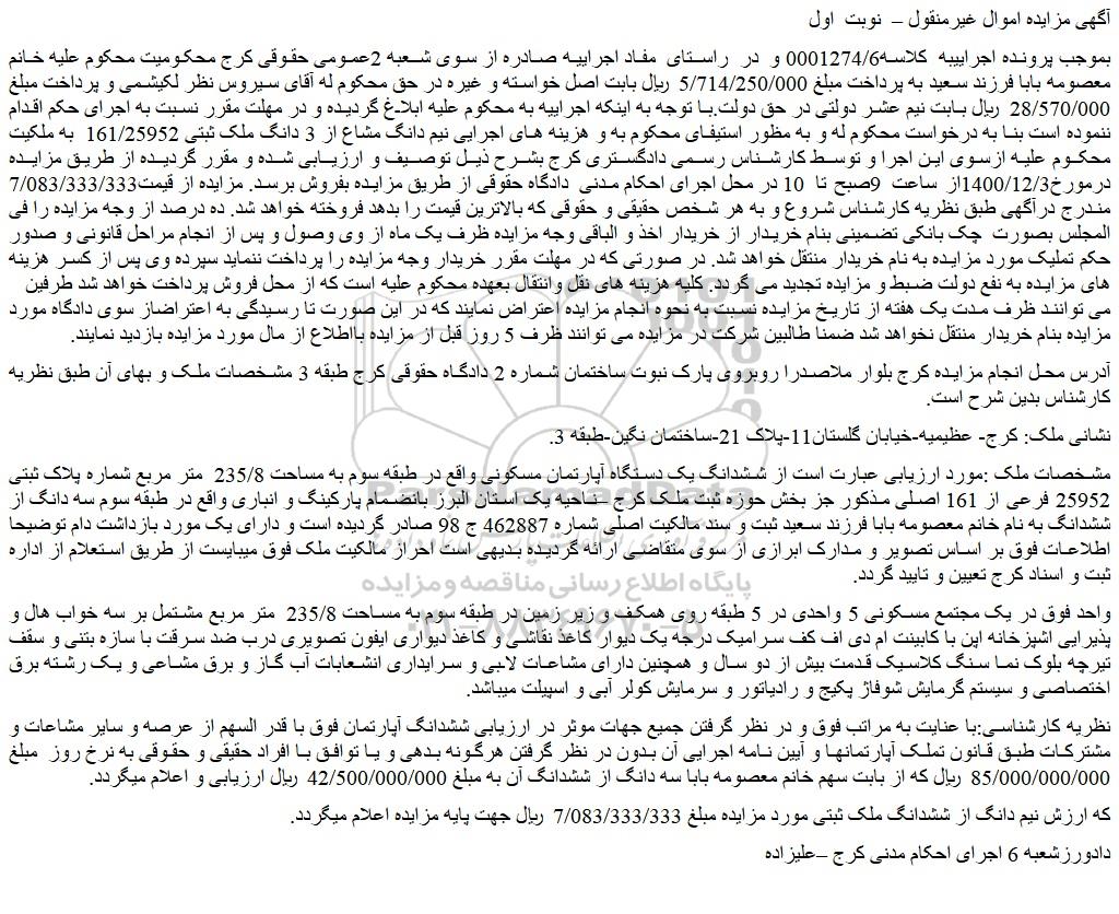 بموجب پرونده اجراییبه کلاسه0001274/6 و در راستای مفاد اجراییه صادره از سوی شعبه 2عمومی حقوقی کرج محکومیت محکوم علیه خانم معصومه بابا فرزند سعید به پرداخت مبلغ 5/714/250/000 ریال بابت اصل خواسته و غیره در حق محکوم له آقای سیروس نظر لکیشمی و پرداخت مبلغ 28/570/000 ریال بابت نیم عشر دولتی در حق دولت.با توجه به اینکه اجراییه به محکوم علیه ابلاغ گردیده و در مهلت مقرر نسبت به اجرای حکم اقدام ننموده است بنا به درخواست محکوم له و به مظور استیفای محکوم به و هزینه های اجرایی نیم دانگ مشاع از 3 دانگ ملک ثبتی 161/25952 به ملکیت محکوم علیه ازسوی این اجرا و توسط کارشناس رسمی دادگستری کرج بشرح ذیل توصیف و ارزیابی شده و مقرر گردیده از طریق مزایده درمورخ1400/12/3از ساعت 9صبح تا 10 در محل اجرای احکام مدنی دادگاه حقوقی از طریق مزایده بفروش برسد. مزایده از قیمت7/083/333/333 مندرج درآگهی طبق نظریه کارشناس شروع و به هر شخص حقیقی و حقوقی که بالاترین قیمت را بدهد فروخته خواهد شد. ده درصد از وجه مزایده را فی المجلس بصورت چک بانکی تضمینی بنام خریدار از خریدار اخذ و الباقی وجه مزایده ظرف یک ماه از وی وصول و پس از انجام مراحل قانونی و صدور حکم تملیک مورد مزایده به نام خریدار منتقل خواهد شد. در صورتی که در مهلت مقرر خریدار وجه مزایده را پرداخت ننماید سپرده وی پس از کسر هزینه های مزایده به نفع دولت ضبط و مزایده تجدید می گردد. کلیه هزینه های نقل وانتقال بعهده محکوم علیه است که از محل فروش پرداخت خواهد شد طرفین می توانند ظرف مدت یک هفته از تاریخ مزایده نسبت به نحوه انجام مزایده اعتراض نمایند که در این صورت تا رسیدگی به اعتراضاز سوی دادگاه مورد مزایده بنام خریدار منتقل نخواهد شد ضمنا طالبین شرکت در مزایده می توانند ظرف 5 روز قبل از مزایده بااطلاع از مال مورد مزایده بازدید نمایند.