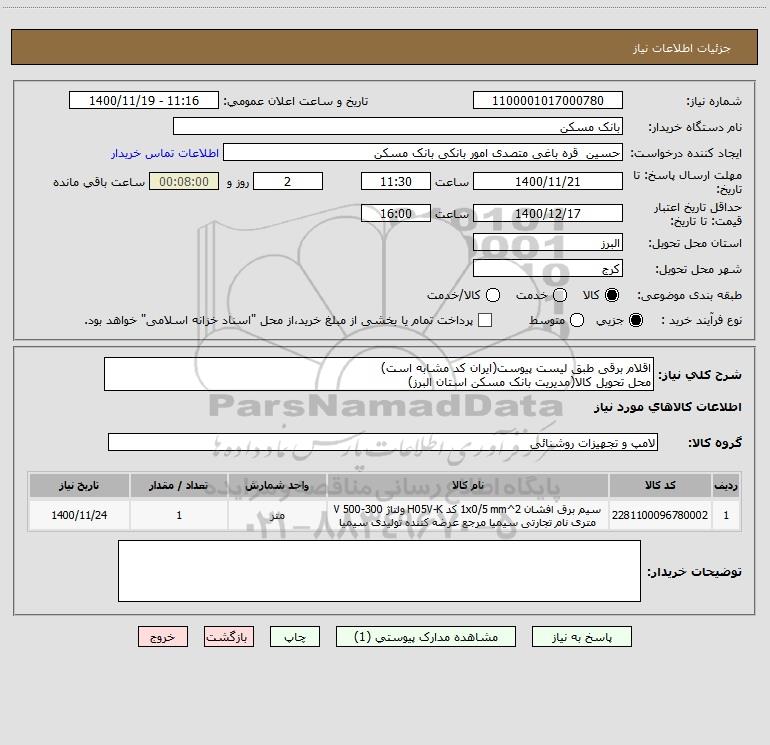 استعلام اقلام برقی طبق لیست پیوست(ایران کد مشابه است) محل تحویل کالا(مدیریت بانک مسکن استان البرز), استعلام اقلام برقی طبق لیست پیوست(ایران کد مشابه است) محل تحویل کالا(مدیریت بانک مسکن استان البرز)