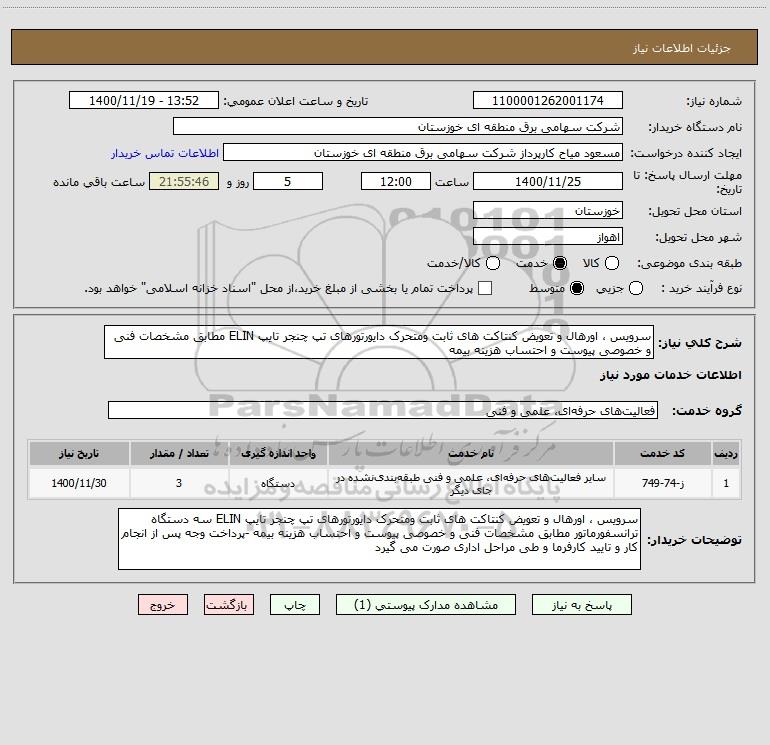 شرح کلی نیاز: سرویس ، اورهال و تعویض کنتاکت های ثابت ومتحرک دایورتورهای تپ چنجر تایپ ELIN مطابق مشخصات فنی و خصوصی پیوست و احتساب هزینه بیمه