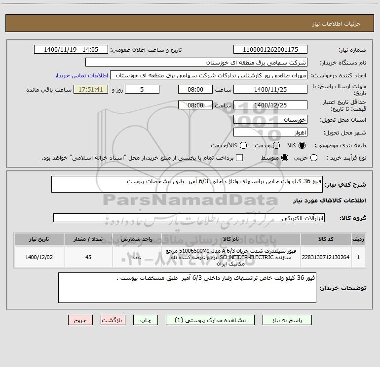 شرح کلی نیاز: فیوز 36 کیلو ولت خاص ترانسهای ولتاژ داخلی 6/3 آمپر طبق مشخصات پیوست