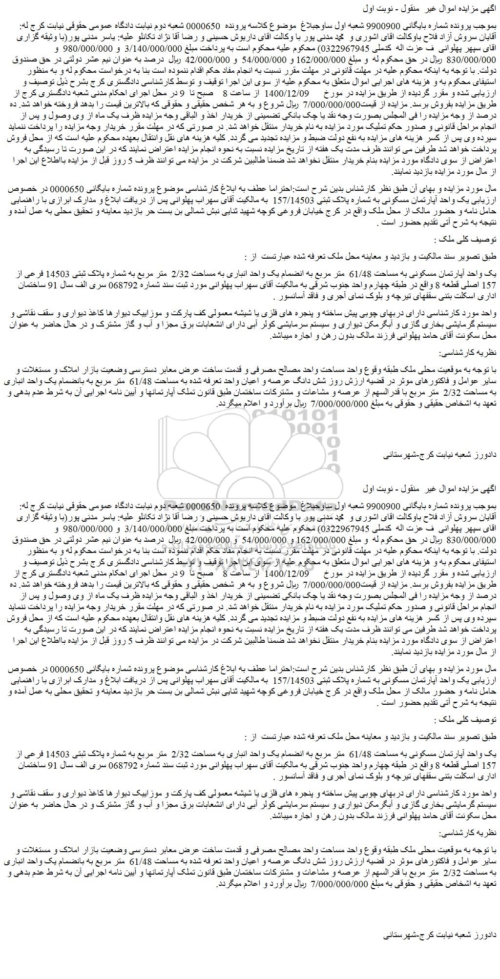 بموجب پرونده شماره بایگانی 9900900 شعبه اول ساوجبلاغ موضوع کلاسه پرونده 0000650 شعبه دوم نیابت دادگاه عمومی حقوقی نیابت کرج له: آقایان سروش آزاد فلاح باوکالت اقای اشوری و محمد مدنی پور با وکالت اقای داریوش حسینی و رضا آقا نژاد تکانلو علیه: یاسر مدنی پور(با وثیقه گزاری اقای سپهر پهلوانی ف عزت اله کدملی 0322967945) محکوم علیه محکوم است به پرداخت مبلغ 3/140/000/000 و 980/000/000 و 830/000/000 ریال در حق محکوم له و مبلغ 162/000/000 و 54/000/000 و 42/000/000 ریال درصد به عنوان نیم عشر دولتی در حق صندوق دولت. با توجه به اینکه محکوم علیه در مهلت قانونی در مهلت مقرر نسبت به انجام مفاد حکم اقدام ننموده است بنا به درخواست محکوم له و به منظور استیفای محکوم به و هزینه های اجرایی اموال متعلق به محکوم علیه از سوی این اجرا توقیف و توسط کارشناسی دادگستری کرج بشرح ذیل توصیف و ارزیابی شده و مقرر گردیده از طریق مزایده در مورخ 1400/12/09 از ساعت 8 صبح تا 9 در محل اجرای احکام مدنی شعبه دادگستری کرج از طریق مزایده بفروش برسد. مزایده از قیمت7/000/000/000 ریال شروع و به هر شخص حقیقی و حقوقی که بالاترین قیمت را بدهد فروخته خواهد شد. ده درصد از وجه مزایده را فی المجلس بصورت وجه نقد یا چک بانکی تضمینی از خریدار اخذ و الباقی وجه مزایده ظرف یک ماه از وی وصول و پس از انجام مراحل قانونی و صدور حکم تملیک مورد مزایده به نام خریدار منتقل خواهد شد. در صورتی که در مهلت مقرر خریدار وجه مزایده را پرداخت ننماید سپرده وی پس از کسر هزینه های مزایده به نفع دولت ضبط و مزایده تجدید می گردد. کلیه هزینه های نقل وانتقال بعهده محکوم علیه است که از محل فروش پرداخت خواهد شد طرفین می توانند ظرف مدت یک هفته از تاریخ مزایده نسبت به نحوه انجام مزایده اعتراض نمایند که در این صورت تا رسیدگی به اعتراض از سوی دادگاه مورد مزایده بنام خریدار منتقل نخواهد شد ضمنا طالبین شرکت در مزایده می توانند ظرف 5 روز قبل از مزایده بااطلاع این اجرا از مال مورد مزایده بازدید نمایند.