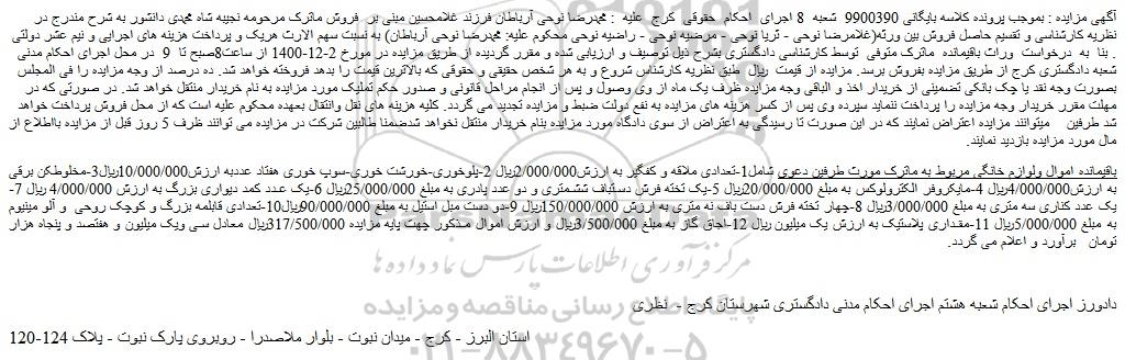 آگهی مزایده : بموجب پرونده کلاسه بایگانی 9900390  شعبه  8 اجرای  احکام  حقوقی  کرج  علیه  : محمدرضا نوحی آرباطان فرزند غلامحسین مبنی بر  فروش ماترک مرحومه نجیبه شاه محمدی دانشور به شرح مندرج در نظریه کارشناسی و تقسیم حاصل فروش بین ورثه(غلامرضا نوحی - ثریا نوحی - مرضیه نوحی - راضیه نوحی محکوم علیه: محمدرضا نوحی آرباطان) به نسبت سهم الارث هریک و پرداخت هزینه های اجرایی و نیم عشر دولتی . بنا  به  درخواست  وراث باقیمانده  ماترک متوفی  توسط کارشناسی دادگستری بشرح ذیل توصیف و ارزیابی شده و مقرر گردیده از طریق مزایده در مورخ 2-12-1400 از ساعت8صبح تا  9  در محل اجرای احکام مدنی شعبه دادگستری کرج از طریق مزایده بفروش برسد. مزایده از قیمت  ریال  طبق نظریه کارشناس شروع و به هر شخص حقیقی و حقوقی که بالاترین قیمت را بدهد فروخته خواهد شد. ده درصد از وجه مزایده را فی المجلس بصورت وجه نقد یا چک بانکی تضمینی از خریدار اخذ و الباقی وجه مزایده ظرف یک ماه از وی وصول و پس از انجام مراحل قانونی و صدور حکم تملیک مورد مزایده به نام خریدار منتقل خواهد شد. در صورتی که در مهلت مقرر خریدار وجه مزایده را پرداخت ننماید سپرده وی پس از کسر هزینه های مزایده به نفع دولت ضبط و مزایده تجدید می گردد. کلیه هزینه های نقل وانتقال بعهده محکوم علیه است که از محل فروش پرداخت خواهد شد طرفین    میتوانند مزایده اعتراض نمایند که در این صورت تا رسیدگی به اعتراض از سوی دادگاه مورد مزایده بنام خریدار منتقل نخواهد شدضمنا طالبین شرکت در مزایده می توانند ظرف 5 روز قبل از مزایده بااطلاع از مال مورد مزایده بازدید نمایند.
