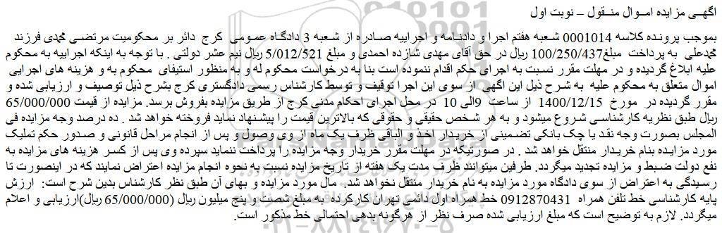 بموجب پرونده کلاسه 0001014 شعبه هفتم اجرا و دادنامه و اجراییه صادره از شعبه 3 دادگاه عمومی  کرج  دائر بر محکومیت مرتضی محمدی فرزند محمدعلی  به پرداخت  مبلغ100/250/437 ریال در حق آقای مهدی شازده احمدی و مبلغ 5/012/521 ریال نیم عشر دولتی . با توجه به اینکه اجراییه به محکوم علیه ابلاغ گردیده و در مهلت مقرر نسبت به اجرای حکم اقدام ننموده است بنا به درخواست محکوم له و به منظور استیفای  محکوم به و هزینه های اجرایی  اموال متعلق به محکوم علیه  به شرح ذیل این اگهی  از سوی این اجرا توقیف و توسط کارشناس رسمی دادگستری کرج بشرح ذیل توصیف و ارزیابی شده و مقرر گردیده در  مورخ  1400/12/15  از ساعت  9الی 10  در محل اجرای احکام مدنی کرج از طریق مزایده بفروش برسد. مزایده از قیمت 65/000/000 ریال طبق نظریه کارشناسی شروع میشود و به هر شخص حقیقی و حقوقی که بالاترین قیمت را پیشنهاد نماید فروخته خواهد شد . ده درصد وجه مزایده فی المجلس بصورت وجه نقد یا چک بانکی تضمینی از خریدار اخذ و الباقی ظرف یک ماه از وی وصول و پس از انجام مراحل قانونی و صدور حکم تملیک مورد مزایده بنام خریدار منتقل خواهد شد . در صورتیکه در مهلت مقرر خریدار وجه مزایده را پرداخت ننماید سپرده وی پس از کسر هزینه های مزایده به نفع دولت ضبط و مزایده تجدید میگردد. طرفین میتوانند ظرف مدت یک هفته از تاریخ مزایده نسبت به نحوه انجام مزایده اعتراض نمایند که در اینصورت تا رسیدگی به اعتراض از سوی دادگاه مورد مزایده به نام خریدار منتقل نخواهد شد.  مال مورد مزایده و بهای آن طبق نظر کارشناس بدین شرح است:  ارزش پایه کارشناسی خط تلفن همراه  0912870431 خط همراه اول دائمی تهران کارکرده  به مبلغ شصت و پنج میلیون ریال (65/000/000 ریال)ارزیابی و اعلام میگردد. لازم به توضیح است که مبلغ ارزیابی شده صرف نظر از هرگونه بدهی احتمالی خط مذکور است.