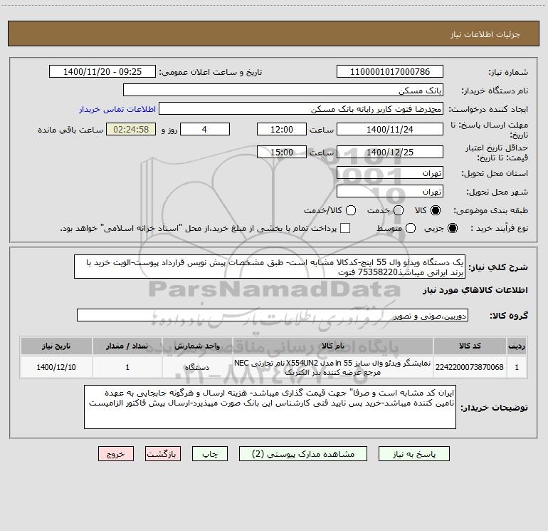شرح کلی نیاز: یک دستگاه ویدئو وال 55 اینچ-کدکالا مشابه است- طبق مشخصات پیش نویس قرارداد پیوست-الویت خرید با برند ایرانی میباشذ75358220 فتوت