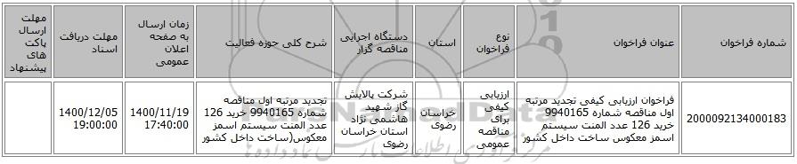 2000092134000183فراخوان ارزیابی کیفی تجدید مرتبه اول مناقصه شماره 9940165 خرید 126 عدد المنت سیستم اسمز معکوس ساخت داخل کشورارزیابی کیفی برای مناقصه عمومیخراسان رضویشرکت پالایش گاز شهید هاشمی نژاد استان خراسان رضویتجدید مرتبه اول مناقصه شماره 9940165 خرید 126 عدد المنت سیستم اسمز معکوس(ساخت داخل کشور1400/11/19 17:40:001400/12/05 19:00:00