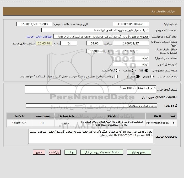 شرح کلی نیاز: قرص استامینوفن /1000 عدد/