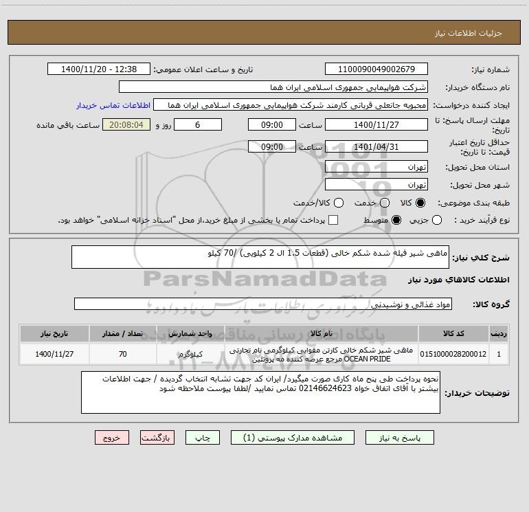 شرح کلی نیاز: ماهی شیر فیله شده شکم خالی (قطعات 1.5 ال 2 کیلویی) /70 کیلو
