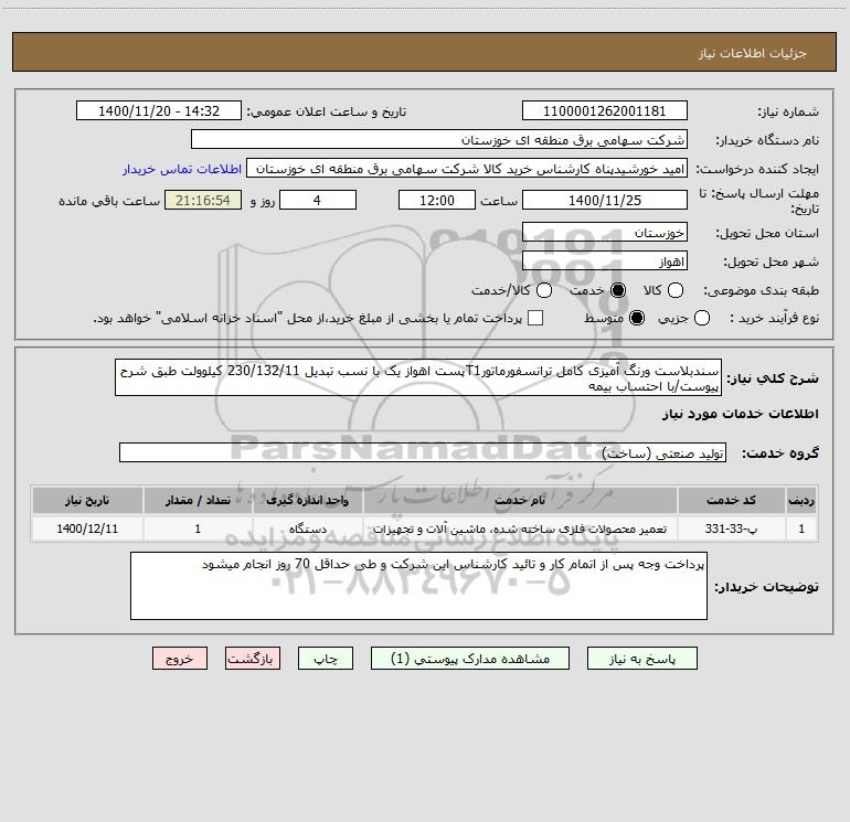 شرح کلی نیاز: سندبلاست ورنگ آمیزی کامل ترانسفورماتورT1پست اهواز یک با نسب تبدیل 230/132/11 کیلوولت طبق شرح پیوست/با احتساب بیمه