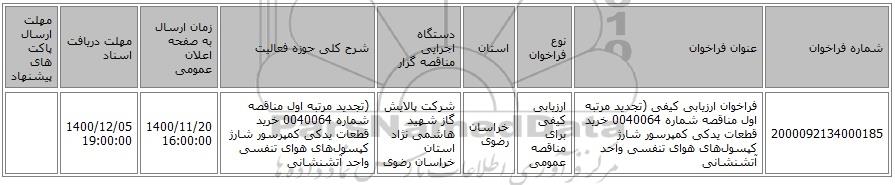 | 2000092134000185 | فراخوان ارزیابی کیفی (تجدید مرتبه اول مناقصه شماره 0040064 خرید قطعات یدکی کمپرسور شارژ کپسولهای هوای تنفسی واحد آتشنشانی | ارزیابی کیفی برای مناقصه عمومی | خراسان رضوی | شرکت پالایش گاز شهید هاشمی نژاد استان خراسان رضوی | (تجدید مرتبه اول مناقصه شماره 0040064 خرید قطعات یدکی کمپرسور شارژ کپسولهای هوای تنفسی واحد آتشنشانی | 1400/11/20 16:00:00 | 1400/12/05 19:00:00 |