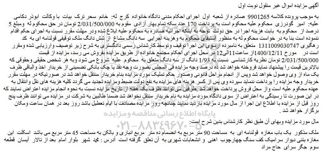 به موجب پرونده کلاسه 9901265  صادره از شعبه  اول  اجرای احکام مدنی دادگاه خانواده  کرج  له:  خانم  سحر ترک  بیات  با وکالت  ابوذر دکامی علیه:  امیر  گودرزی  محکوم علیه محکوم است به پرداخت 170 عدد سکه تمام بهار آزادی  مقوم به 2/031/500/000 تومان در حق محکوم له  ومبلغ 5 درصد از  محکوم به  بابت هزینه اجرا در حق دولت  توجه به اینکه اجرائیه صادره به محکوم علیه ابلاغ شده ودر مهلت مقرر نسبت به اجرای حکم اقدام ننموده است بنا به در خواست محکوم له به منظور استیفای محکوم به وهزینه اجرایی  سه دانگ مشاع  از شش دانگ ملک توقیفی قولنامه ای به  کد  رهگیری 1311009030747  متعلق به نامبرده ازسوی این اجرا توقیف وتوسط کارشناس رسمی دادگستری به شرح زیر توصیف وارزیابی شده ومقرر است در    مورخ 1400/12/11از ساعت11الی12 در محل اجرای احکام مجتمع خانواده از طریق مزایده بفروش می رسد، مزایده از قیمت 2/031/500/000 تومان نظریه کارشناسی  نسبت به 1/93 دانگ از سه دانگ متعلق به  محکوم  علیه  شروع می شود وبه هر شخص حقیقی وحقوقی که بالاترین قیمت را پیشنهاد نماید فروخته خواهد شد ده درصد وجه مزایده فی المجلس بصورت وجه نقد یا چک بانکی تضمینی از خریدار اخذ والباقی ظرف یک ماه از وی وصول خواهد شد وپس از انجام مراحل قانونی وصدور حکم تملیک مورد مزایده بنام خریدار منتقل خواهد شد در صورتیکه در مهلت مقرر خریدار وجه مزایده را پرداخت ننماید سپرده وی پس از کسر هزینه های مزایده به نفع دولت ضبط ومزایده تجدید می گردد کلیه هزینه های نقل وانتقال به عهده محکوم علیه است واز محل فروش پرداخت خواهد شد .طرفین می توانند ظرف یک هفته از تاریخ مزایده نسبت به نحوه انجام مزایده اعتراض نمایند که در این صورت تا رسیدگی به اعتراض از سوی دادگاه مورد مزایده به نام خریدار منتقل نخواهد شد ضمنا طالبین به شرکت در مزایده می توانند ظرف پنج روز قبل از مزایده با اطلاع این اجرا از مال مورد مزایده بازدید نمایند چنانچه روز مزایده مصادف با ایام تعطیل باشد روز بعد در همان ساعت ومکان برگزار خواهد شد .