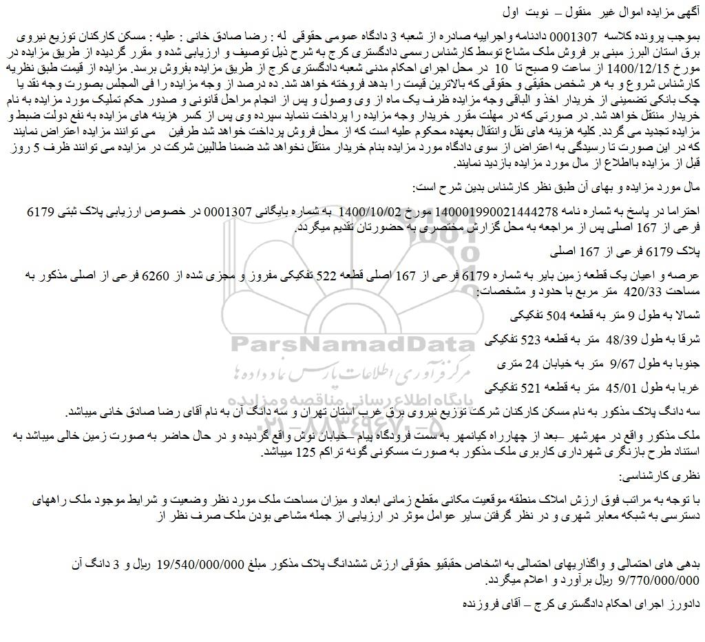 بموجب پرونده کلاسه 0001307 دادنامه واجراییه صادره از شعبه 3 دادگاه عمومی حقوقی له : رضا صادق خانی : علیه : مسکن کارکنان توزیع نیروی برق استان البرز مبنی بر فروش ملک مشاع توسط کارشناس رسمی دادگستری کرج به شرح ذیل توصیف و ارزیابی شده و مقرر گردیده از طریق مزایده در مورخ 1400/12/15 از ساعت 9 صبح تا 10 در محل اجرای احکام مدنی شعبه دادگستری کرج از طریق مزایده بفروش برسد. مزایده از قیمت طبق نظریه کارشناس شروع و به هر شخص حقیقی و حقوقی که بالاترین قیمت را بدهد فروخته خواهد شد. ده درصد از وجه مزایده را فی المجلس بصورت وجه نقد یا چک بانکی تضمینی از خریدار اخذ و الباقی وجه مزایده ظرف یک ماه از وی وصول و پس از انجام مراحل قانونی و صدور حکم تملیک مورد مزایده به نام خریدار منتقل خواهد شد. در صورتی که در مهلت مقرر خریدار وجه مزایده را پرداخت ننماید سپرده وی پس از کسر هزینه های مزایده به نفع دولت ضبط و مزایده تجدید می گردد. کلیه هزینه های نقل وانتقال بعهده محکوم علیه است که از محل فروش پرداخت خواهد شد طرفین می توانند مزایده اعتراض نمایند که در این صورت تا رسیدگی به اعتراض از سوی دادگاه مورد مزایده بنام خریدار منتقل نخواهد شد ضمنا طالبین شرکت در مزایده می توانند ظرف 5 روز قبل از مزایده بااطلاع از مال مورد مزایده بازدید نمایند.