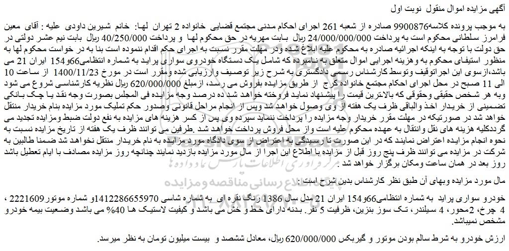 به موجب پرونده کلاسه9900876 صادره از شعبه 261 اجرای احکام مدنی مجتمع قضایی  خانواده 2 تهران  لها:  خانم  شیرین داودی  علیه : آقای  معین فرامرز سلطانی محکوم است به پرداخت 24/000/000/000 ریال  بابت مهریه در حق محکوم لها  و پرداخت 40/250/000 ریال  بابت نیم عشر دولتی در حق دولت با توجه به اینکه اجرائیه صادره به محکوم علیه ابلاغ شده ودر مهلت مقرر نسبت به اجرای حکم اقدام ننموده است بنا به در خواست محکوم لها به منظور استیفای محکوم به وهزینه اجرایی اموال متعلق به نامبرده که شامل یک دستگاه خودروی سواری پراید به شماره انتظامی66و154 ایران 21 می باشد،ازسوی این اجراتوقیف وتوسط کارشناس رسمی دادگستری به شرح زیر توصیف وارزیابی شده ومقرر است در مورخ 1400/11/23  از ساعت 10 الی 11 صبح در محل اجرای احکام مجتمع خانواده کرج  از طریق مزایده بفروش می رسد، ازمبلغ 620/000/000 ریال نظریه کارشناسی شروع می شود وبه هر شخص حقیقی وحقوقی که بالاترین قیمت را پیشنهاد نماید فروخته خواهد شد ده درصد وجه مزایده فی المجلس بصورت وجه نقد یا چک بانکی تضمینی از خریدار اخذ والباقی ظرف یک هفته از وی وصول خواهد شد وپس از انجام مراحل قانونی وصدور حکم تملیک مورد مزایده بنام خریدار منتقل خواهد شد در صورتیکه در مهلت مقرر خریدار وجه مزایده را پرداخت ننماید سپرده وی پس از کسر هزینه های مزایده به نفع دولت ضبط ومزایده تجدید می گرددکلیه هزینه های نقل وانتقال به عهده محکوم علیه است واز محل فروش پرداخت خواهد شد .طرفین می توانند ظرف یک هفته از تاریخ مزایده نسبت به نحوه انجام مزایده اعتراض نمایند که در این صورت تا رسیدگی به اعتراض از سوی دادگاه مورد مزایده به نام خریدار منتقل نخواهد شد ضمنا طالبین به شرکت در مزایده می توانند ظرف پنج روز قبل از مزایده با اطلاع این اجرا از مال مورد مزایده بازدید نمایند چنانچه روز مزایده مصادف با ایام تعطیل باشد روز بعد در همان ساعت ومکان برگزار خواهد شد .