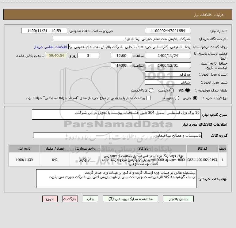 شرح کلی نیاز: 10 برگ ورق استنلس استیل 304 طبق مشخصات پیوست با تحویل در این شرکت.