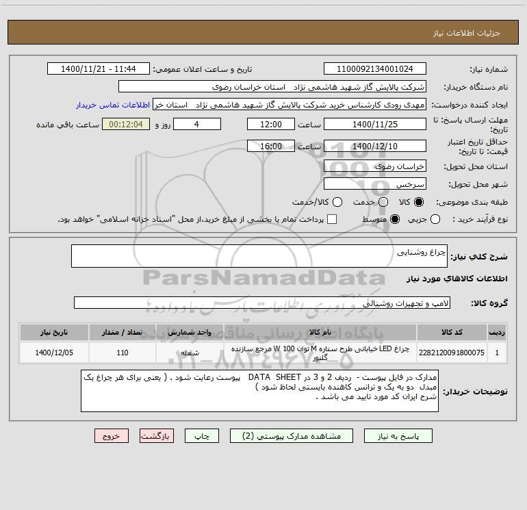 نام دستگاه خریدار:شرکت پالایش گاز شهید هاشمی نژاد استان خراسان رضوی