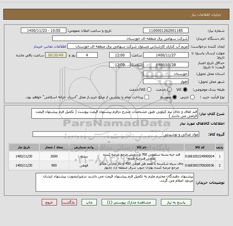 شرح کلی نیاز: قند لفاف و چای نیم کیلویی طبق مشخصات مندرج درفرم پیشنهاد قیمت پیوست ( تکمیل فرم پیشنهاد قیمت الزامی می باشد )